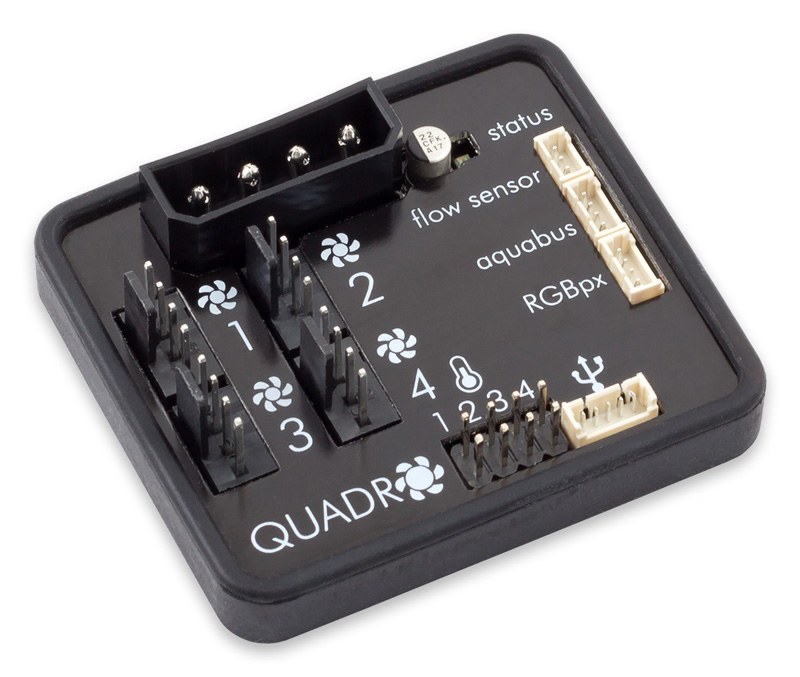 Mit dem QUADRO präsentiert Aqua Computer eine vierkanalige PWM-Lüftersteuerung mit hervorragendem Funktionsumfang, die gleichermaßen für wassergekühlte und luftgekühlte Computer geeignet ist. Zusätzlich besitzt QUADRO einen RGBpx-Ausgang zur individuellen Ansteuerung von bis zu 64 adressierbaren LEDs.